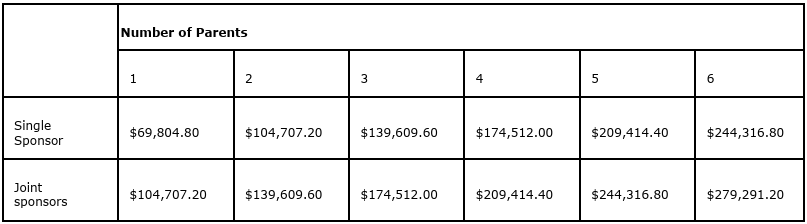 Each sponsor must be an acceptable sponsor, agree to undertakings, not be a dependent child themselves, and (if you’re relying on sponsor income instead of your own funds) meet minimum income requirements. Up to two adult children can sponsor, and a sponsor can sponsor up to six parents (including partners).